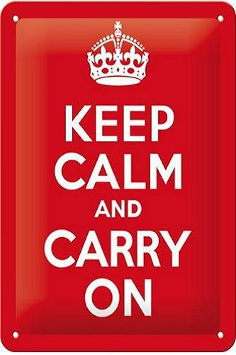 Keep Calm and carry On. Metalen wandbord in reliëf 20 x 30 cm.